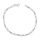This pretty lightweight piece features a classic Infinity design pattern in lustrous Sterling Silver. Center link features a shimmering 0.01 Carat Round cut accent Diamond, adding extra glamour to this elegant bracelet. Bracelet fastens with a classic lobster claw clasp.